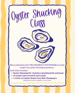 Each guest will enjoy a curated setup that includes 12 fresh oysters with classic accoutrements, along with all the tools you need for the experience. You’ll be working with your own shucking knife and towel, and for added safety, protective chain link gloves will be provided for use during the class.