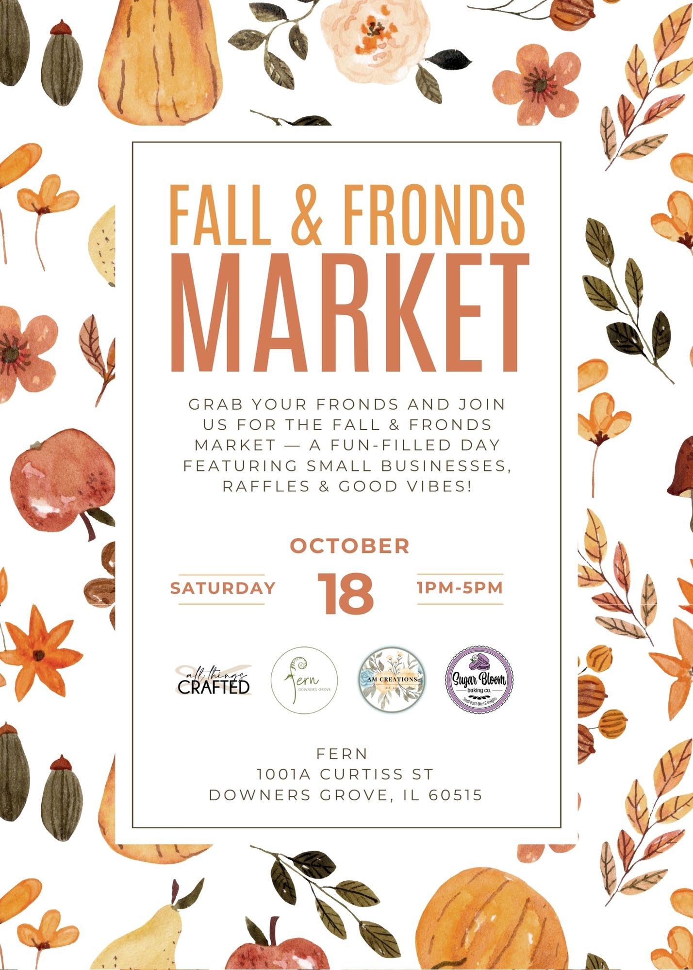 Grab your fronds and join us on Saturday, October 18th, from 1–5PM at Fern, Downers Grove’s newest plant shop, for a festive afternoon of fall fun! Celebrate the season while shopping a curated selection of local small businesses featuring handcrafted goods, tasty treats, vintage treasures, and more! Featured businesses include All Things Crafted, Fern, AM Creations, and Sugar Bloom Baking Co.