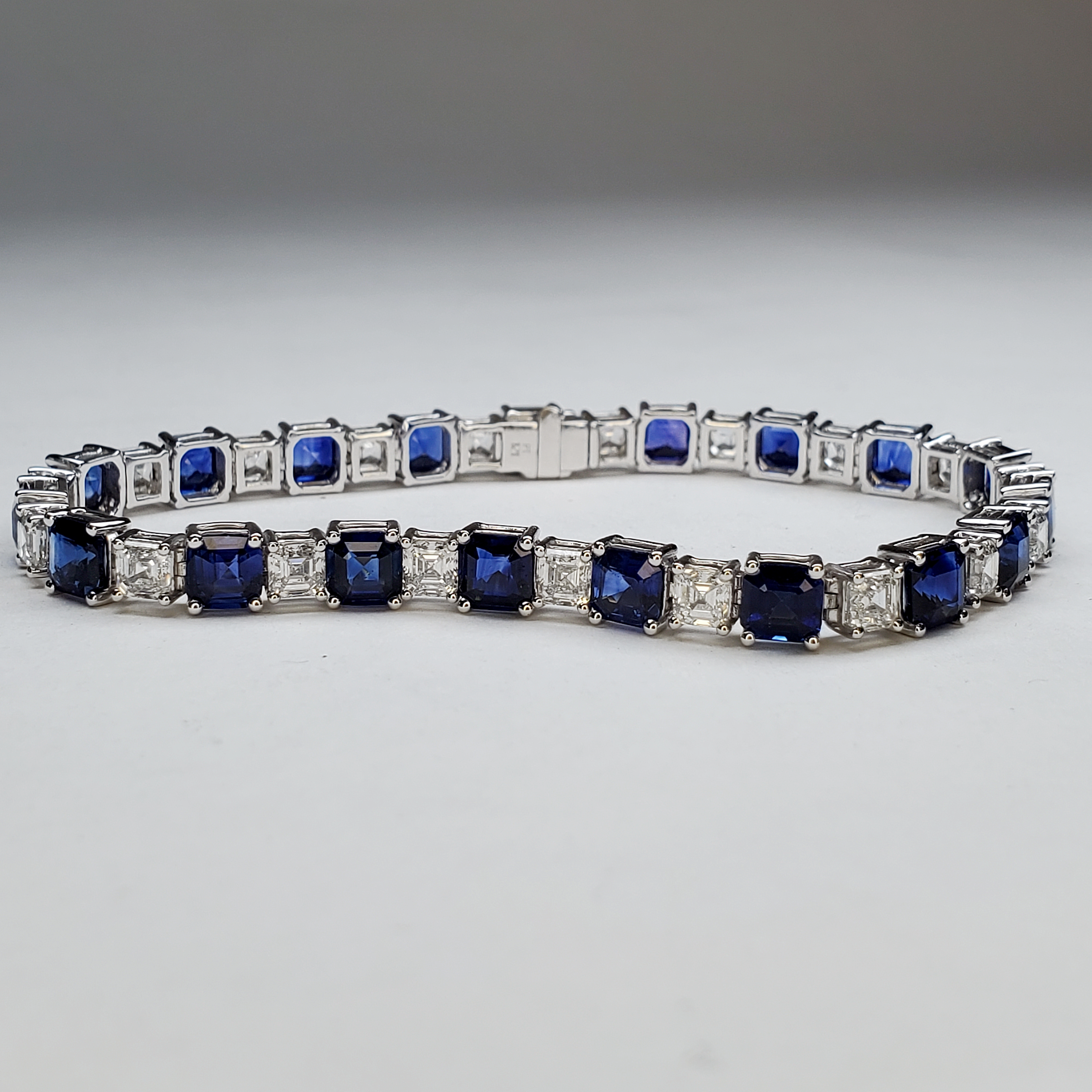 A masterpiece of timeless elegance at home on the red carpet. Bathed in the cool radiance of platinum, this bracelet entwines the understated elegance of Asscher-cut diamonds with vivid blue sapphires. It whispers of the romance and opulence of a bygone era. 12.13cttw of sapphires, and 5.78cttw of diamonds, set in platinum. Price upon request.