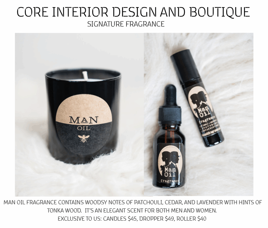 Man Oil fragrance contains woodsy notes of Patchouli, Cedar & Lavender with hints of Tonka wood. An elegant scent for both men and women. Exclusive to us: Candles: $45, Dropper: $49, Roller: $40.